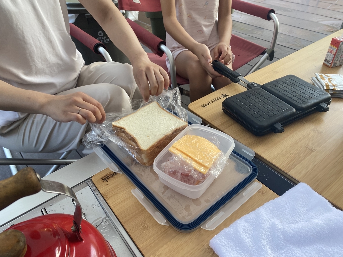 というわけで用意されていた朝食のホットサンドの材料を取りに。